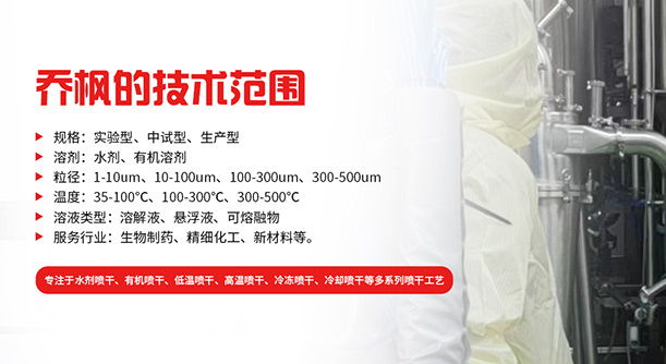 上海喬楓實業有限公司,成立于2012年,是從事噴霧干燥設備的研發設計、生產、銷售(小型噴霧干燥機實驗型噴霧干燥機,35℃低溫噴霧干燥機有機溶劑噴霧干燥機低溫閉式循環噴霧干燥機、超細粉末噴霧干燥機、噴霧冷凍干燥機、真空噴霧干燥機、氣流噴霧干燥機,噴霧造粒干燥機離心噴霧干燥機,沸騰制粒機等)和售后于一體的綜合性公司,本公司現成為一家致力于為生物制藥、精細化工、新能源、陶瓷造粒及食品工程等領域提供全套解決方案的整線交鑰匙工程企業。
